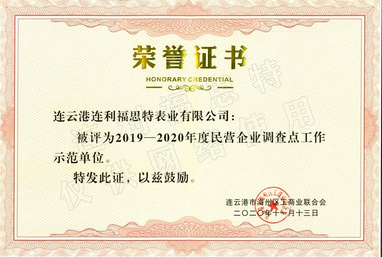 近日,連云港連利福思特表業有限公司榮獲“2019-2020年度民營企業調查點工作示范單位”稱號。 民營企...